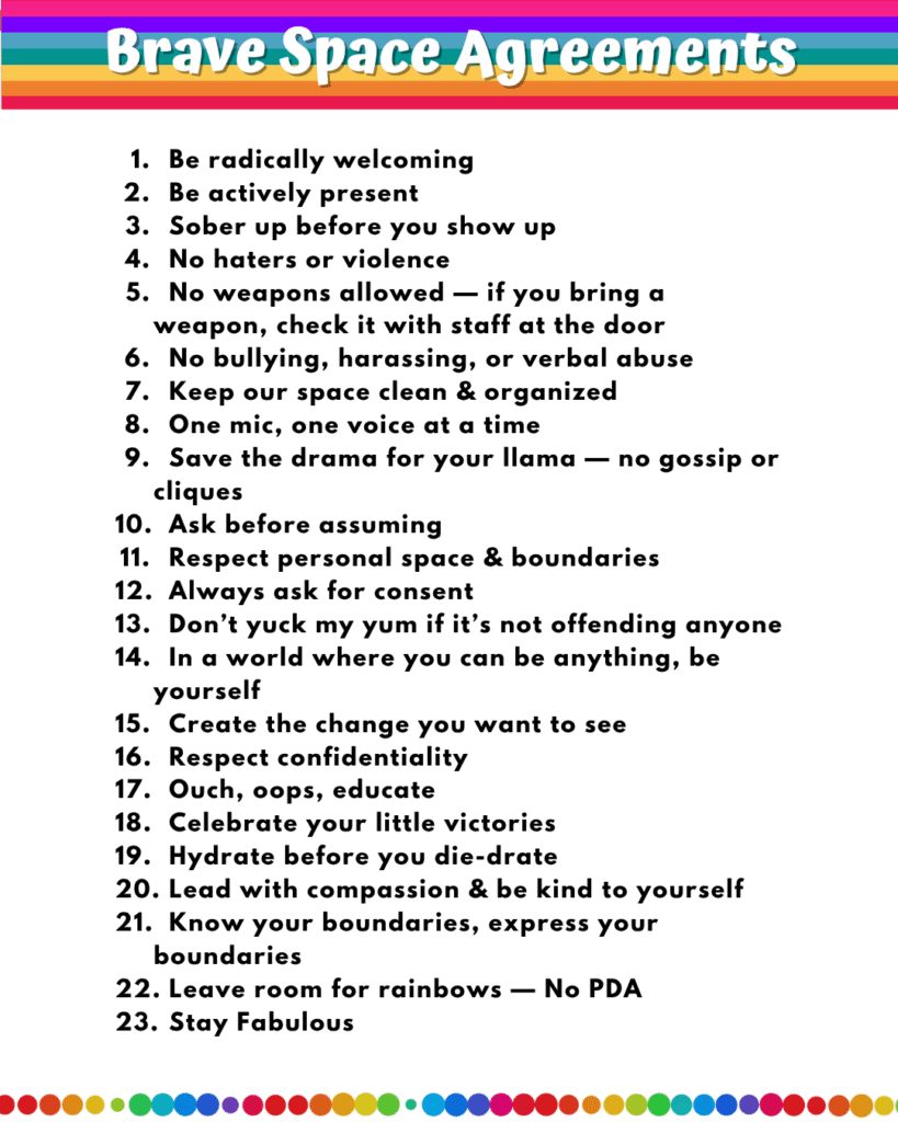 Our brave space agreements help keep our community in healthy relationship to one another. All members of our community (youth, staff, and volunteers) are accountable to these, and we believe in a restorative/reparative justice approach to conflict resolution.